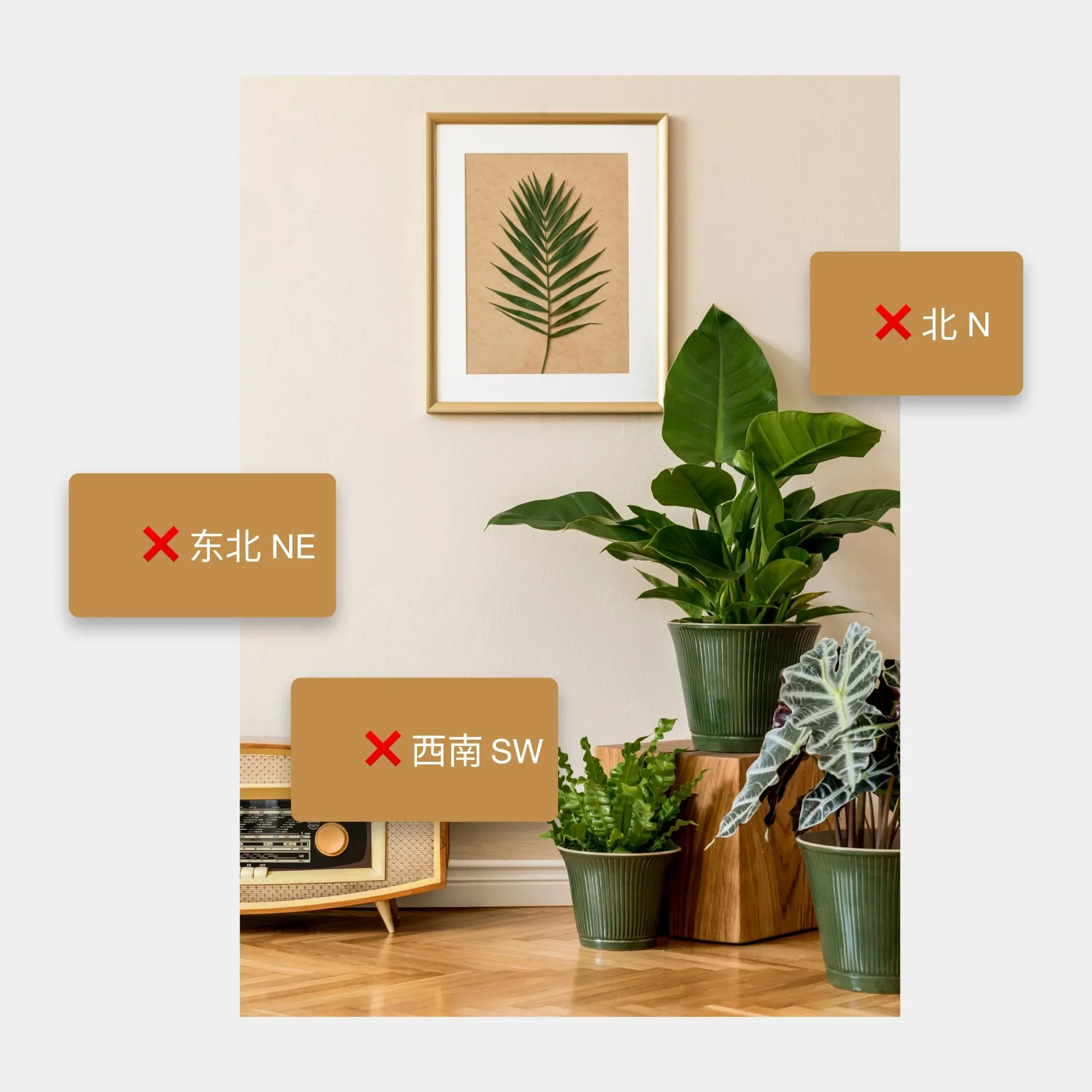 Placing green plants incorrectly in the southwest, northeast, and north directions can block energy circulation. Therefore, these three directions are not suitable for placing green plants.
